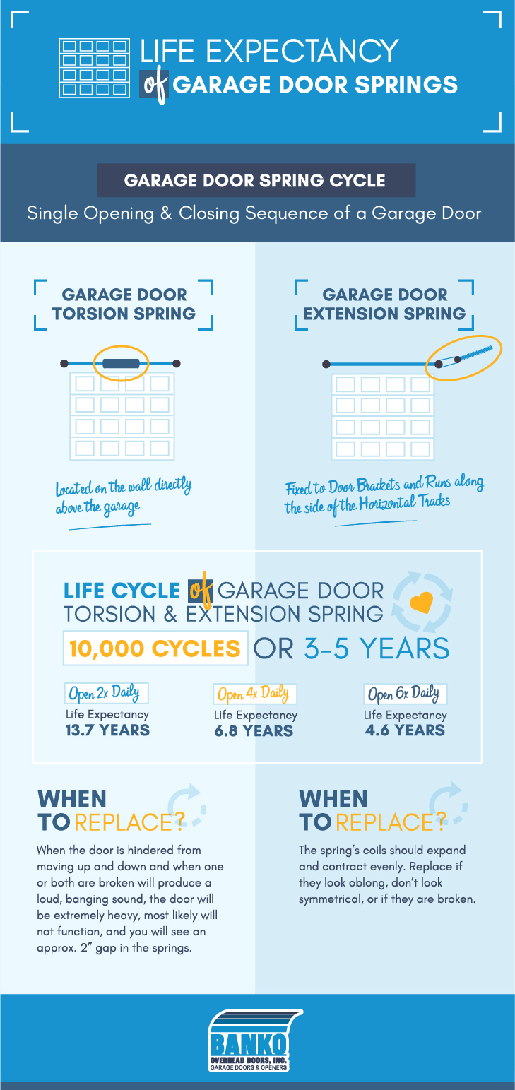 Garage door springs have a life expectancy measured in cycles not years. One cycle is a single opening and closing sequence, which means the more you use the door, the shorter the life expectancy of the springs. In busy households, the number of cycles can add up quickly, increasing the chance that you’ll experience a broken garage door spring.